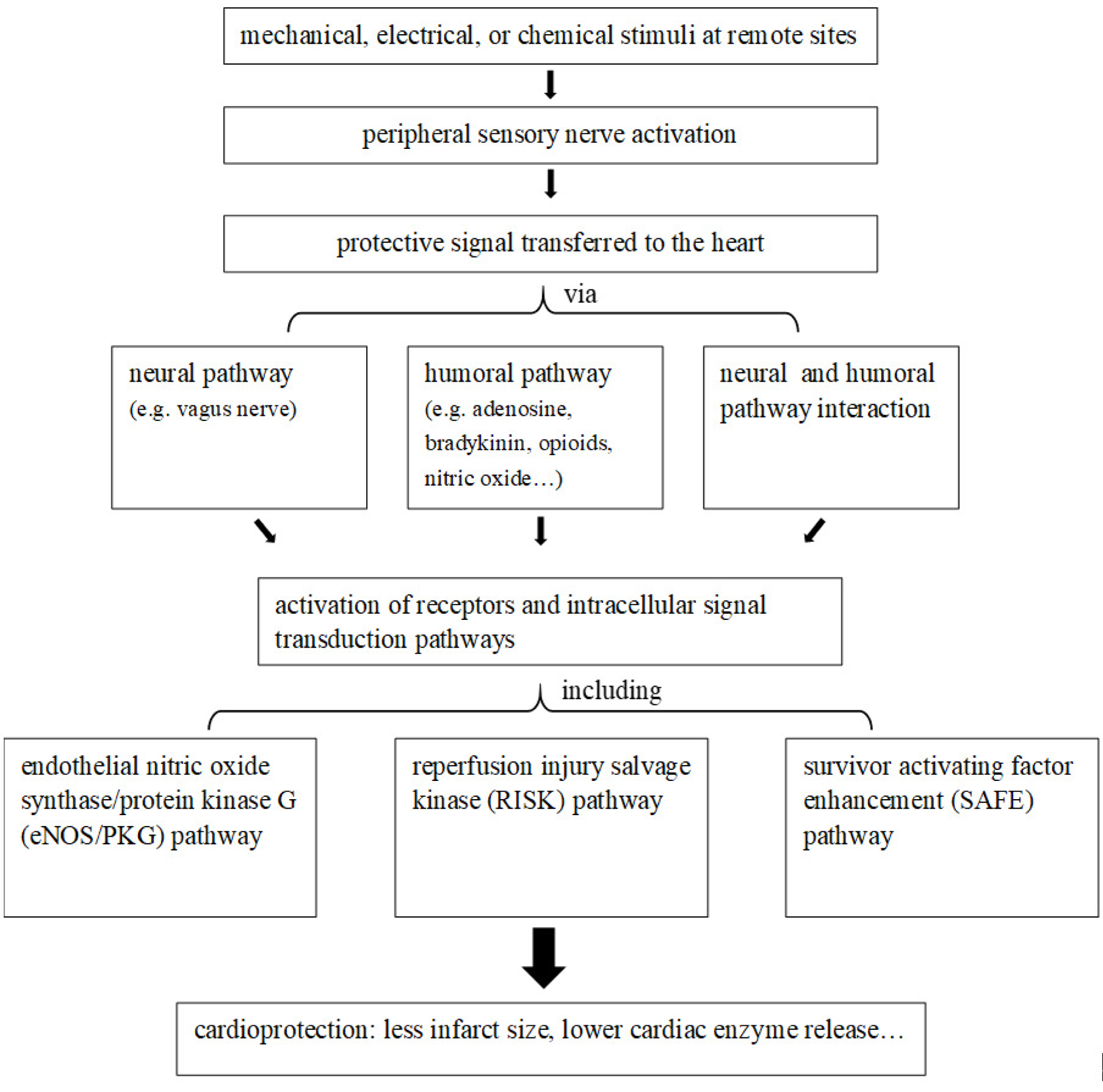The potential mechanisms underlying remote ischemic preconditioning (RIPC) are still not fully understood. A better mechanistic understanding will help translate its cardioprotective use to clinical practice. Currently, it has been suggested that the mechanism of RIPC may be based on three steps: Stimuli at remote sites, protective signal transferred through neural or humoral pathways to the target organ, leading to the final activation of receptors and intracellular signal transduction pathways as illustrated in Figure 1.