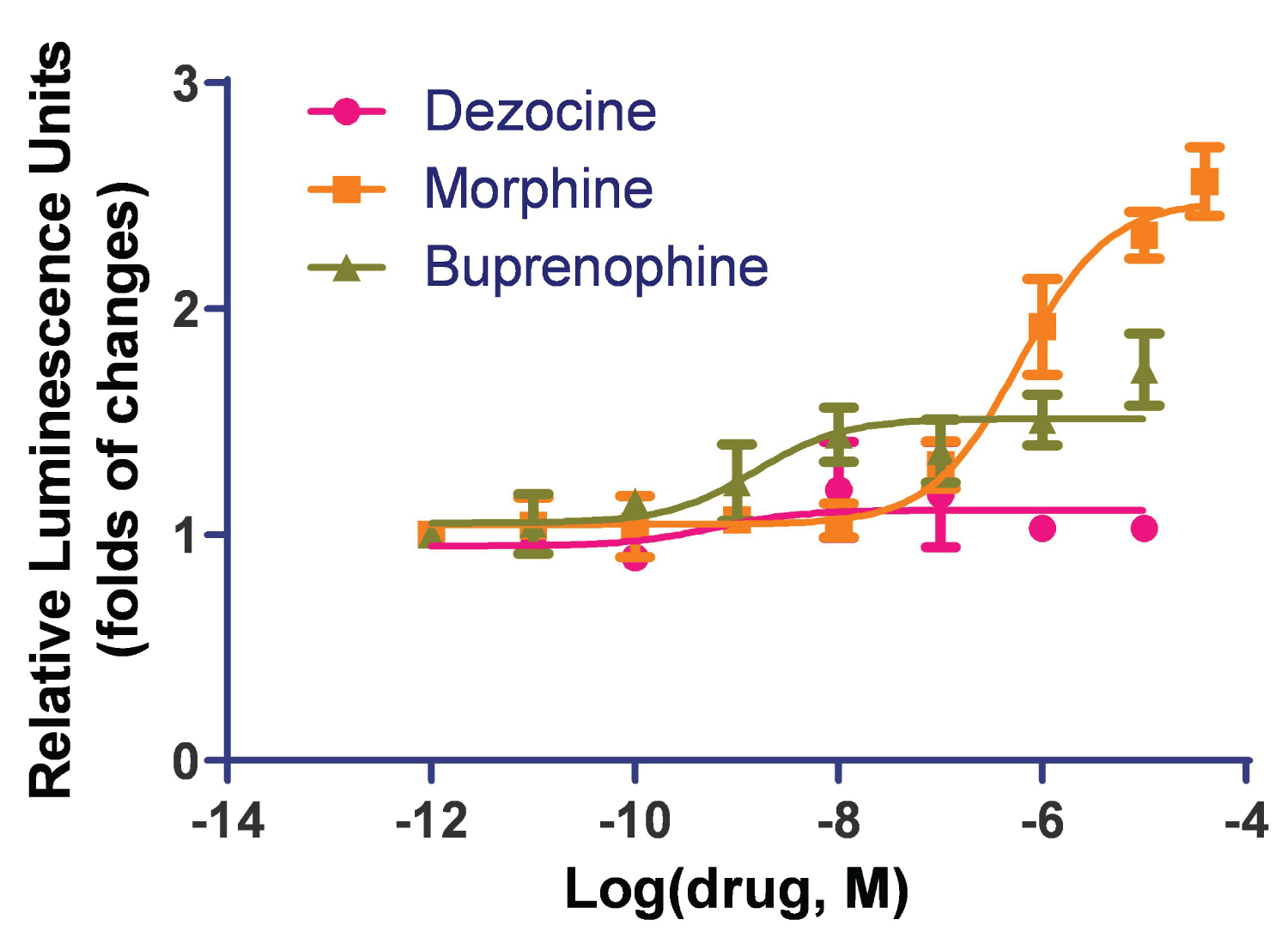 Figure 1: Dezocine does not activate the beta-arrestin pathway in human MOR. The beta-arrestin recruitment study was performed in an HTLA cell line stably transfected with the human mu opioid receptor. Both morphine and buprenorphine induced beta-arrestin recruitment. Buprenorphine indicated partial activation and morphine indicated full activation of the MOR in the beta-arrestin pathway. Dezocine did not induce beta-arrestin recruitment. Data are presented as mean ± standard error.
