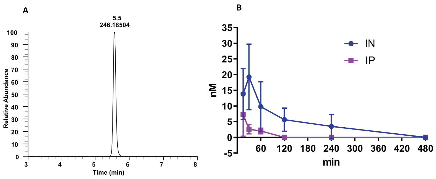 Figure 2: Kinetics of nano-dezocine (A) single peak of dezocine in a blood sample; (B) Comparison of dezocine concentration in plasma with intraperitoneal (IP) and intranasal (IN) dosing (2.0 mg/kg) in adult male and female rats. Data are presented as mean ± standard deviation. Significant difference between the two groups was observed using 2-way Analysis of variance to compare the difference between the two groups with a p value of 0.002. n = 3 per route of administration per sex.