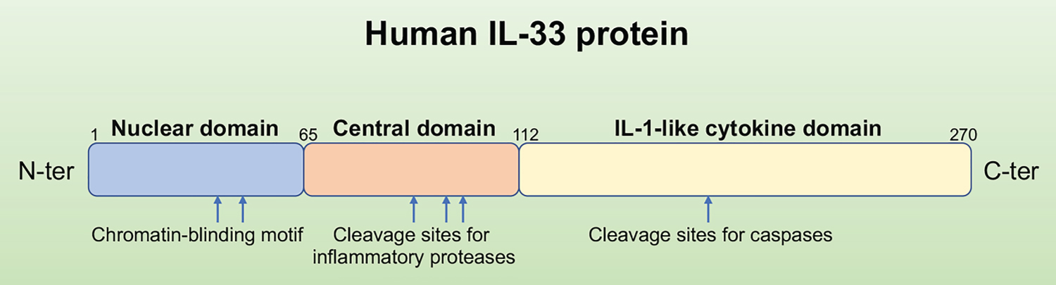 Figure 1: Primary structure of the human IL-33 protein. The full-length IL-33 is a protein with 270 amino acids. It has the N-terminal nuclear structural domain and the C-terminal IL-1-like cytokine structural domain, the cleavage sites for proteases involved in IL-33 activation (inflammatory proteases) or inactivation (caspases) are shown above.