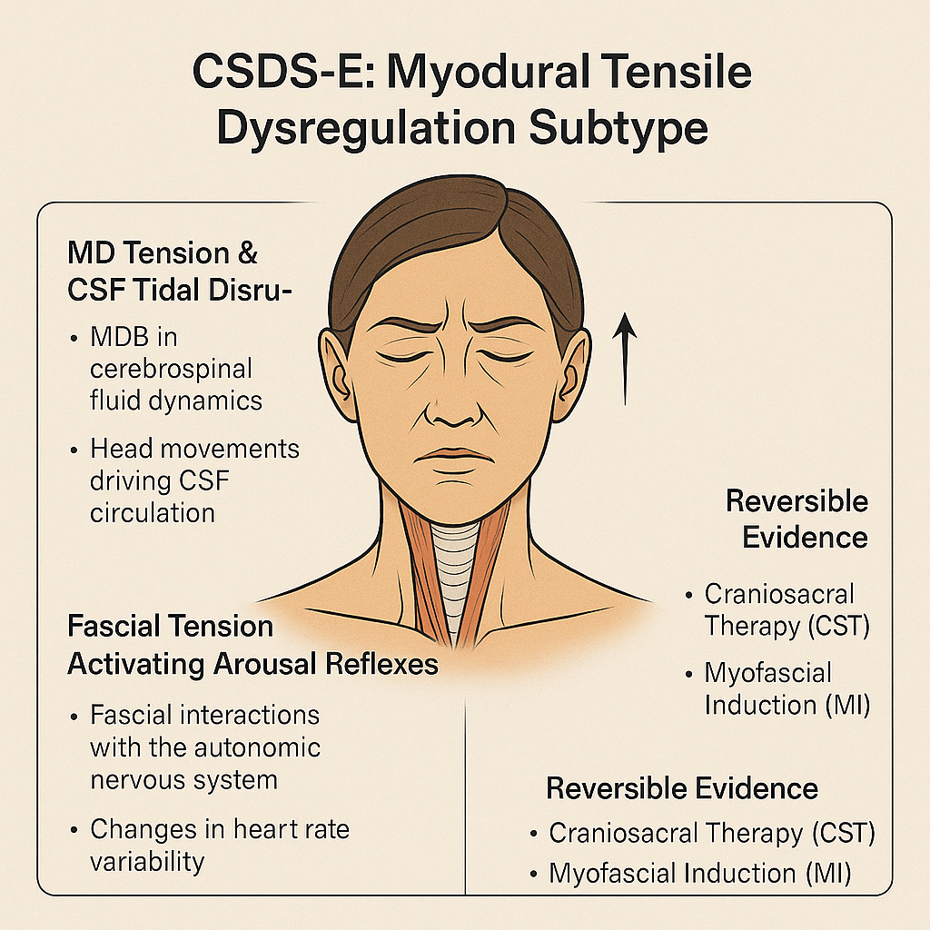 We synthesized evidence from anatomical studies, HRV-based autonomic evaluation, glymphatic flow imaging, and clinical interventions including fascial manipulation, craniosacral therapy, and acupuncture. Subtypes A–J were constructed based on shared pathomechanisms such as sympathetic overactivation, cervical dural tension, and myodural bridge dysfunction.