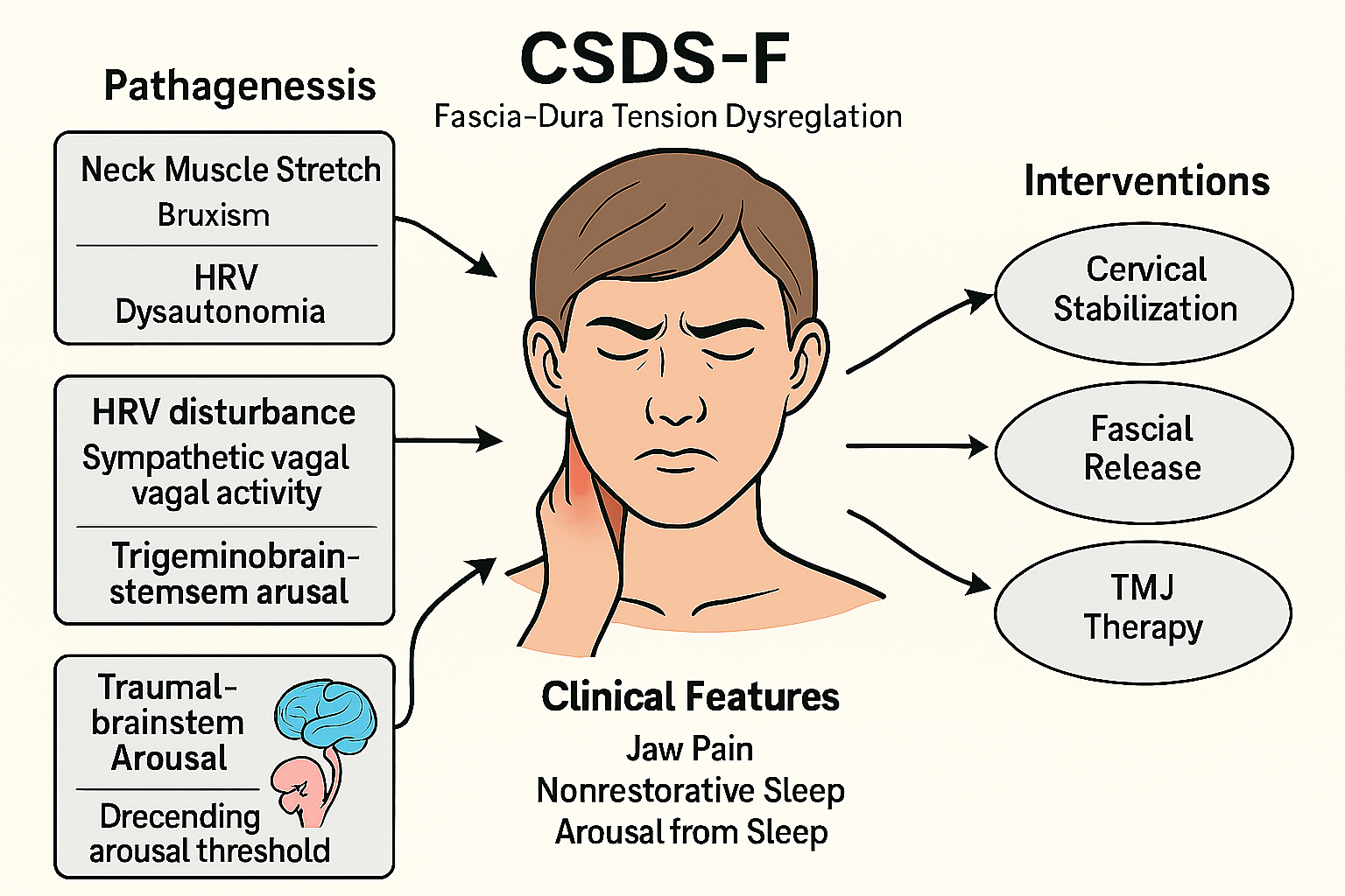 CSDS-A: Cervicogenic Sleep Disorder Syndrome - Type A; Sympathetic Overactivation: A subtype characterized by cervical-driven sympathetic hyperarousal; Cervical Sympathetic Stimulation: Functional or structural excitation of the cervical sympathetic trunk or ganglia; Sympathetic Blockade: Pharmacologic or interventional suppression of sympathetic output (e.g., stellate ganglion block); Autonomic Modulation: Interventions aimed at rebalancing the autonomic nervous system (e.g., HRV biofeedback, vagus nerve stimulation); Cervical Intervention: Manual or procedural therapies targeting the cervical spine or musculature