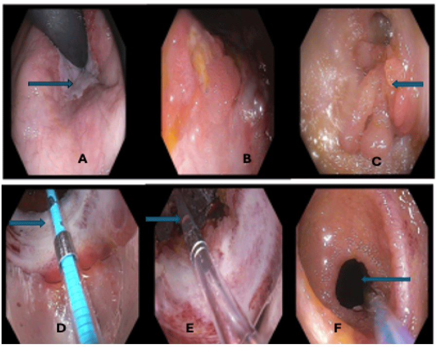 Figure 1: Endoscopic images of terminal ileum, stricture and polyps. The arrow in A indicates the ileum stricture (A, B); the arrow indicates the polyps of the ileum (C); the arrows indicate the dilation of the ileum stricture using the balloon dilator (D, E); the arrow indicates the ileum opening (F).