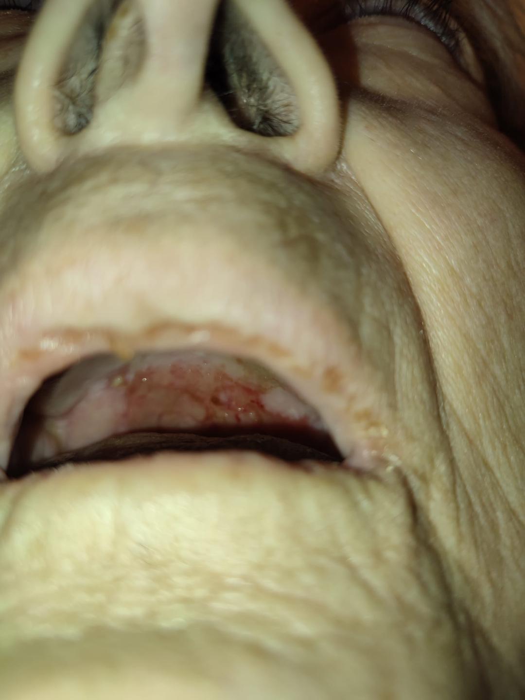 She had dyspnea, and her exercise capacity was approximately 3 METs. On physical examination, there were hyperemic ulcerated lesions on the soft palate, and mouth opening was sufficient (Figure 1). Stridor was present during labored inhalation and exhalation. Chest auscultation revealed a systolic murmur in the tricuspid region, clicks in the prosthetic valve, and slightly prolonged expiration. Also, an ulcerated lesion covering the soft palate and right palatoglossal arch and two eroded skin sites on the left scapula were noted.